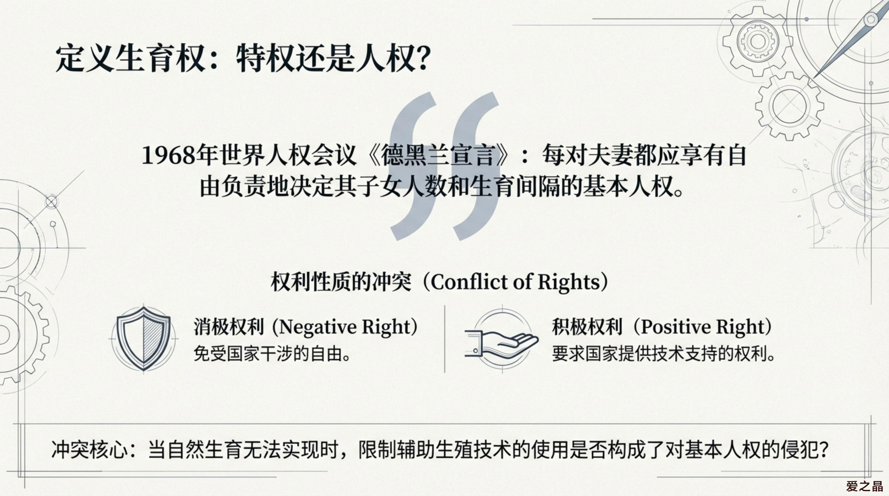 • 传统视角: 1968年《德黑兰宣言》规定,“每一对夫妻都应享有自由负责地决定其子女的人数和生育间隔的基本人权”。这一传统定义将生育权主体主要限定在“夫妻”范围内。• 现代呼声: 随着技术的发展,要求借助辅助生殖技术实现生育权的呼声日益高涨,人们开始要求对生育权的主体、客体和内容进行相应的扩展。