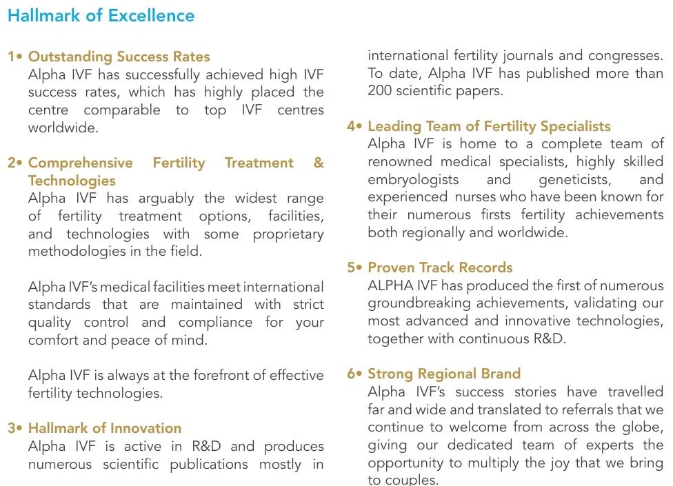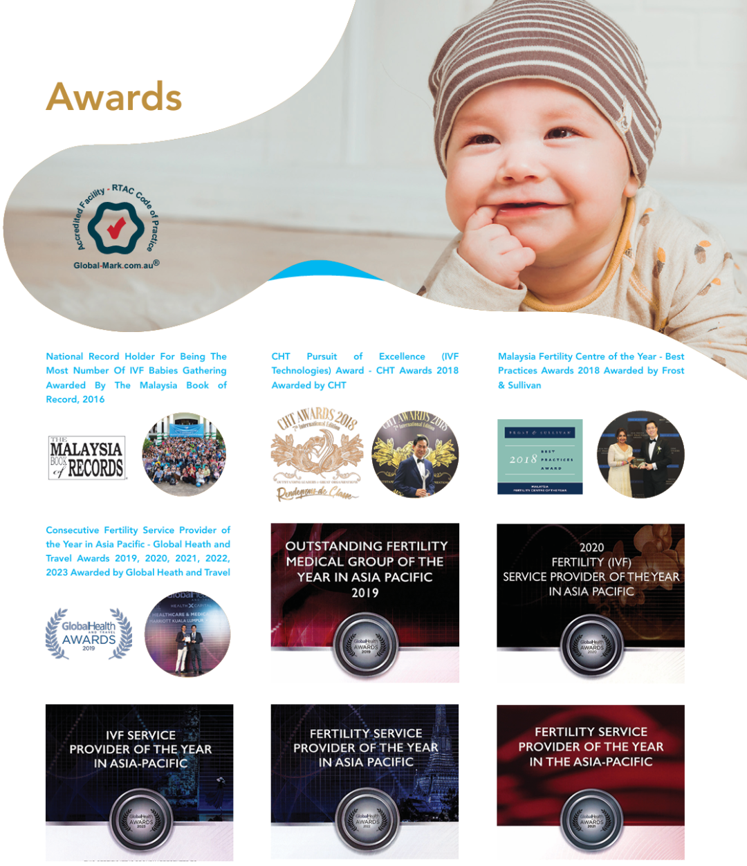 Alpha IVF was accorded the Frost & Sullivan’s 2018 Malaysia Fertility Centre of the year for leadership, technological innovation, customer service and strategic product development as well as Asia Pacific Fertility Service Provider of the year 2019, Fertility (IVF) Service Provider of the Year in Asia Pacific 2020 and Best Fertility – Excellence in Technology Service Provider of the Year in Asia Pacific 2020, as well as Asia Pacific Fertility Service Provider of the year for year 2021, 2022 and 2023 by Global health Asia-Pacific Awards.