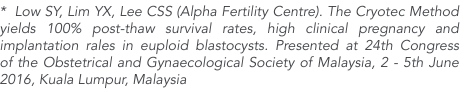 * Lee C.S.S., Low S.Y., Lim Y.X., Keith J (Alpha Fertility Centre). Vitrified-warmed good graded euploid blastocysts aged < 120hours at the time of transfer yield superior clinical pregnancy and implantation rates. Presented at 24th Congress of the Obstetrical and Gynecological Society of Malaysia, 2 - 5th June 2016, Kuala Lumpur, Malaysia