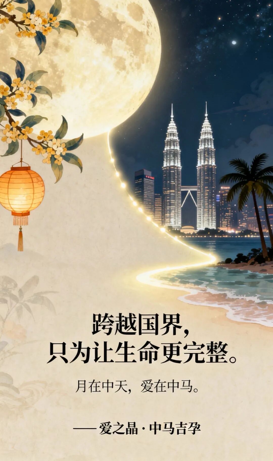 🌸在中国人的心中,中秋节不仅是吃月饼、赏明月的日子,更是一种情感的归属。无论身在何处,当那一轮圆月升起,我们都会抬头望向同一片天,思念着心中最亲的人。就像月亮的圆满象征着团聚,每一个新生命的诞生,都是家庭最深的圆满。在这个充满思念与祝福的节日里,我们更能体会“团圆”的意义。有的家庭,正在月下共享天伦;有的家庭,还在期待那一份迟来的幸福。而爱之晶 · 中马吉孕的存在,正是为了帮助每一个家庭,跨越距离、时间与医学的障碍,让爱传承,让生命延续,让团圆不再缺席。我们相信,医学的进步不只是技术的突破,更是无数家庭心愿的实现。从生命的第一道光开始,到宝宝的第一声啼哭,每一个过程都承载着父母的期盼与守护。而在这条“从希望到圆满”的旅程中,爱之晶始终陪伴在每一位准父母身边,用科学与爱,为“家”的意义,添上一份更深的圆润与温柔。今晚的月光,跨越海峡与国界,照亮马来西亚,也温暖着中国的心。我们在不同的地方,却怀着相同的祝福:愿每一个家庭,都能在月光下团聚;愿每一个愿望,都能在爱与希望中诞生。✨ 爱之晶 · 中马吉孕让生命更完整,让家庭更团圆。📅 中秋快乐 · 团圆有爱🌕 愿人长久,千里共婵娟
