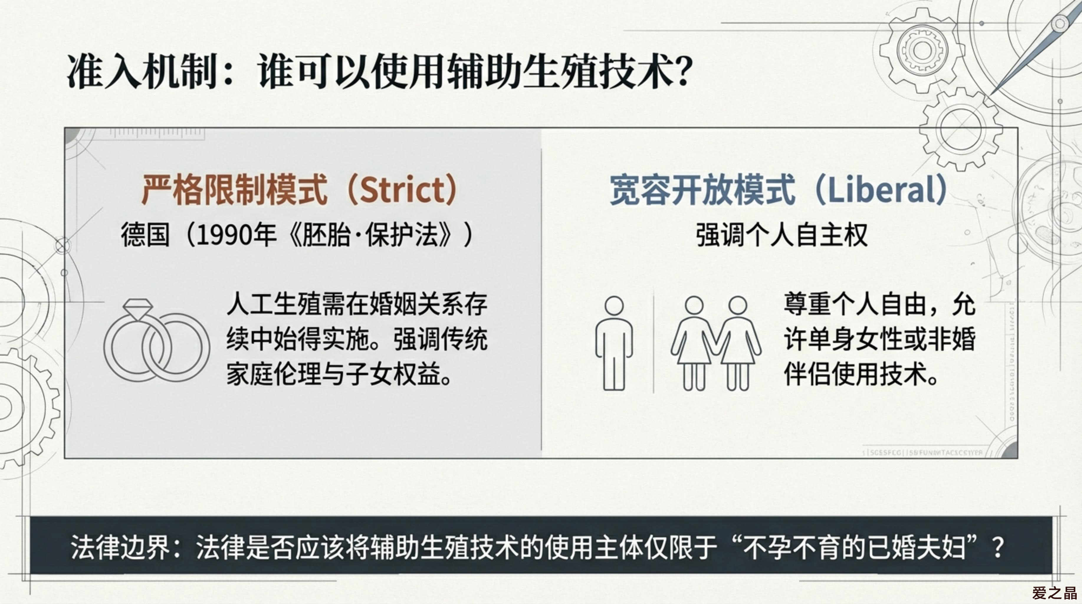 在实践中,单身人士是否能合法享有这一权利,受制于各国的法律规定:• 严格限制(限制单身人士): 来源提到,有些国家的立法非常谨慎,对适用主体施加严格限制。例如,德国1990年的《胚胎保护法》明确规定,人工生殖必须在婚姻关系存续中才能实施。这意味着在这些法律体系下,单身人士不享有辅助生殖的权利。• 宽容开放(尊重个人自由): 另一些国家则更为宽容,强调尊重个人自由。在这些国家,生育被视为一种个人权利的延伸,不一定必须以婚姻为前提。