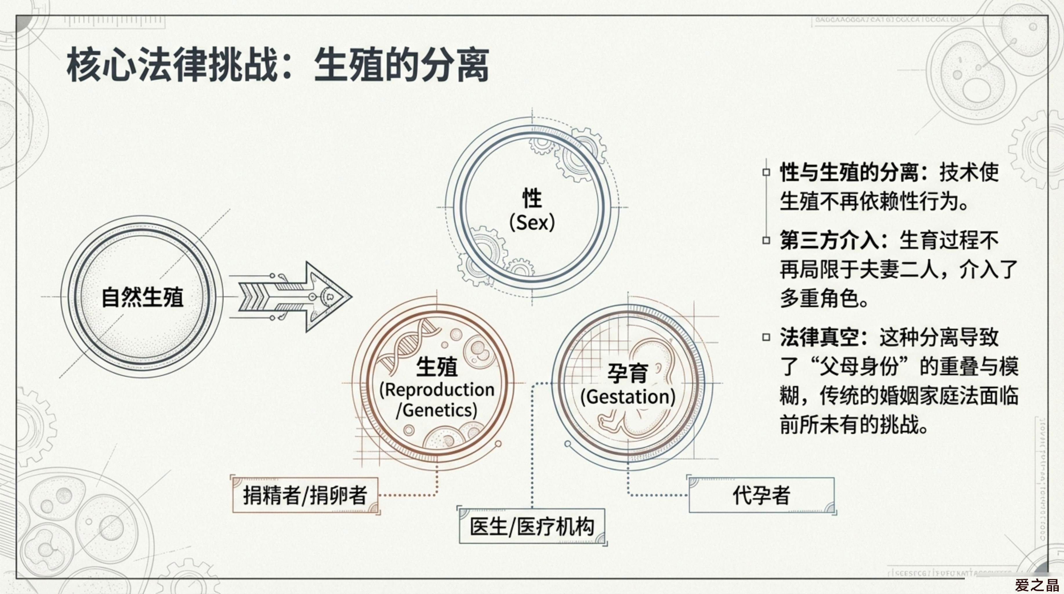 传统的法律逻辑通常默认“婚姻—性行为—生育”的三位一体。辅助生殖技术打破了这一传统:• 性与生育的分离: 现代生殖技术使得生育不再依赖于自然的性行为,引发了关于生育主体(如单身人士、同性伴侣)法律地位的广泛讨论。• 婚姻与生育的脱钩: 来源指出,辅助生殖使得 血缘关系变得复杂模糊 ,出现了有婚姻的父母与无婚姻的父母等多种角色并存的局面,呈现出多元化趋势。