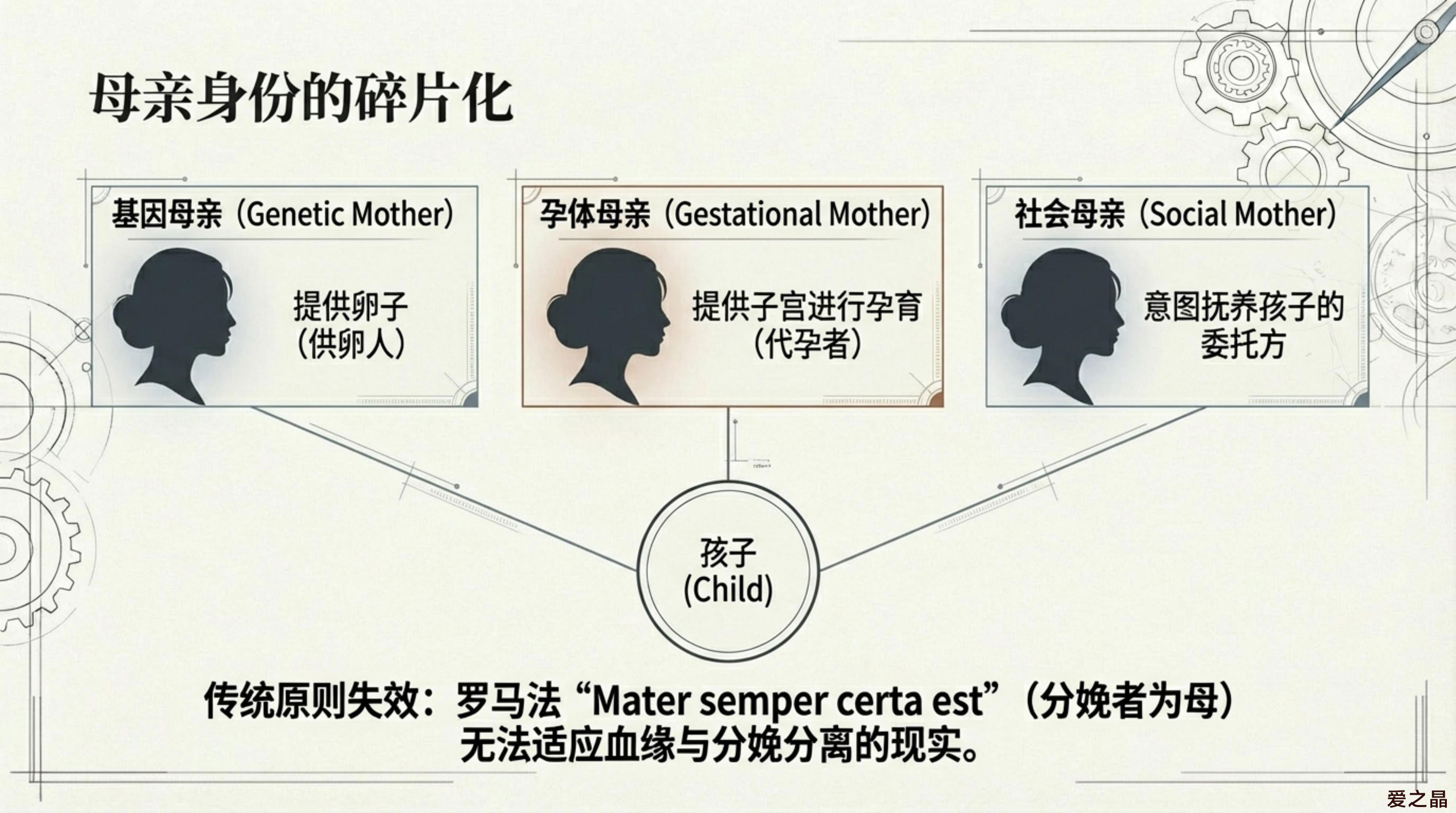 当冲突发生时,法律必须在多重角色中做出抉择:• 父亲身份: 出现了“生物学父亲”(提供精子的供精者)与“社会学父亲”(基于抚育意愿和法律契约承担责任的丈夫)的分离。• 母亲身份: 出现了“遗传学母亲”(提供卵子者)、“孕育母亲”(代孕或分娩者)以及“社会学母亲”(实际抚育者)的冲突。
