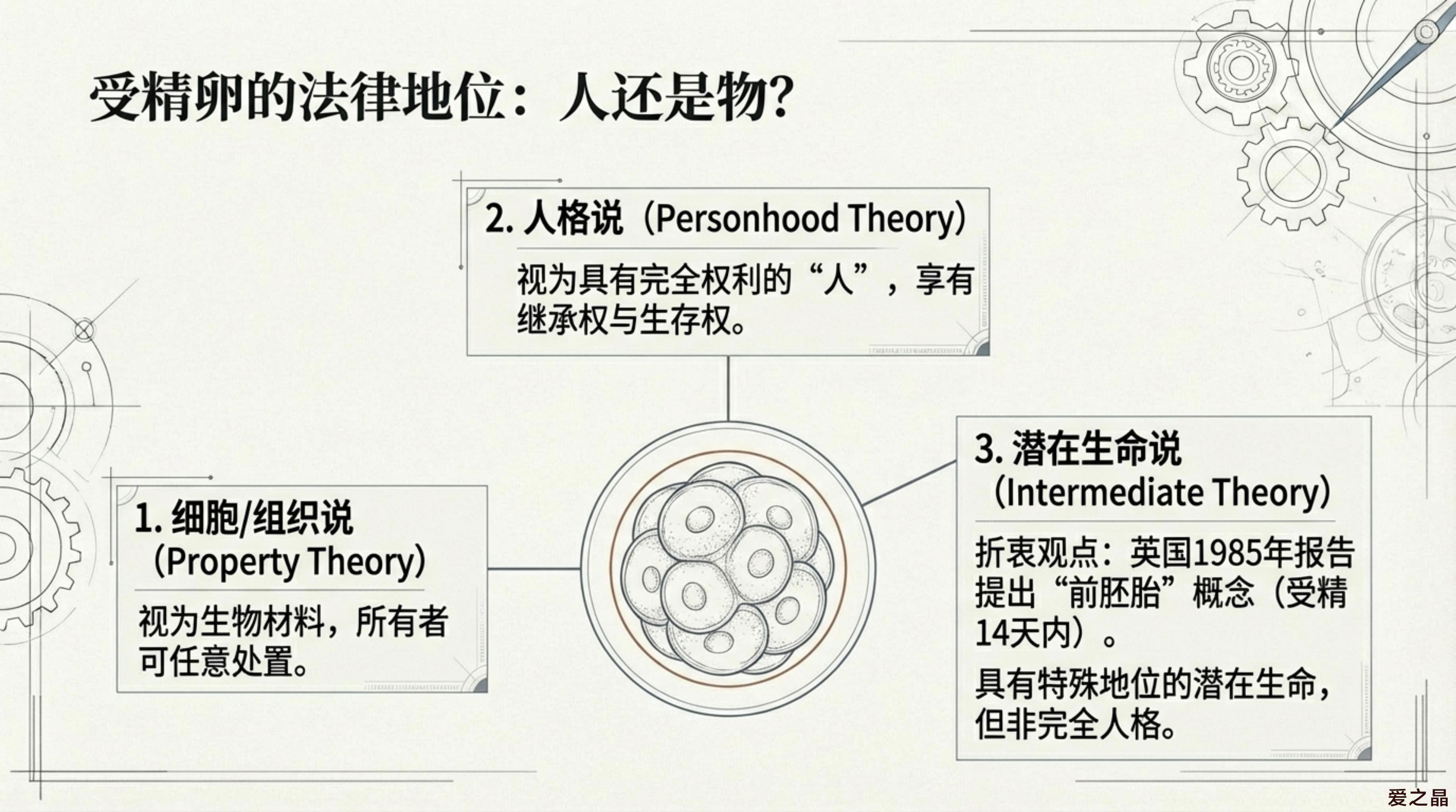 这种法律定性的困难源于技术对自然的突破。来源指出,辅助生殖技术使得人体的生殖细胞(精子、卵子及受精卵)能够从体内走到体外,并以冷冻方式保存以备未来使用。 这一物理位置的改变,打破了传统法律中关于“人”与“物”的清晰界限,产生了一系列“复杂难解的基因遗传问题”。