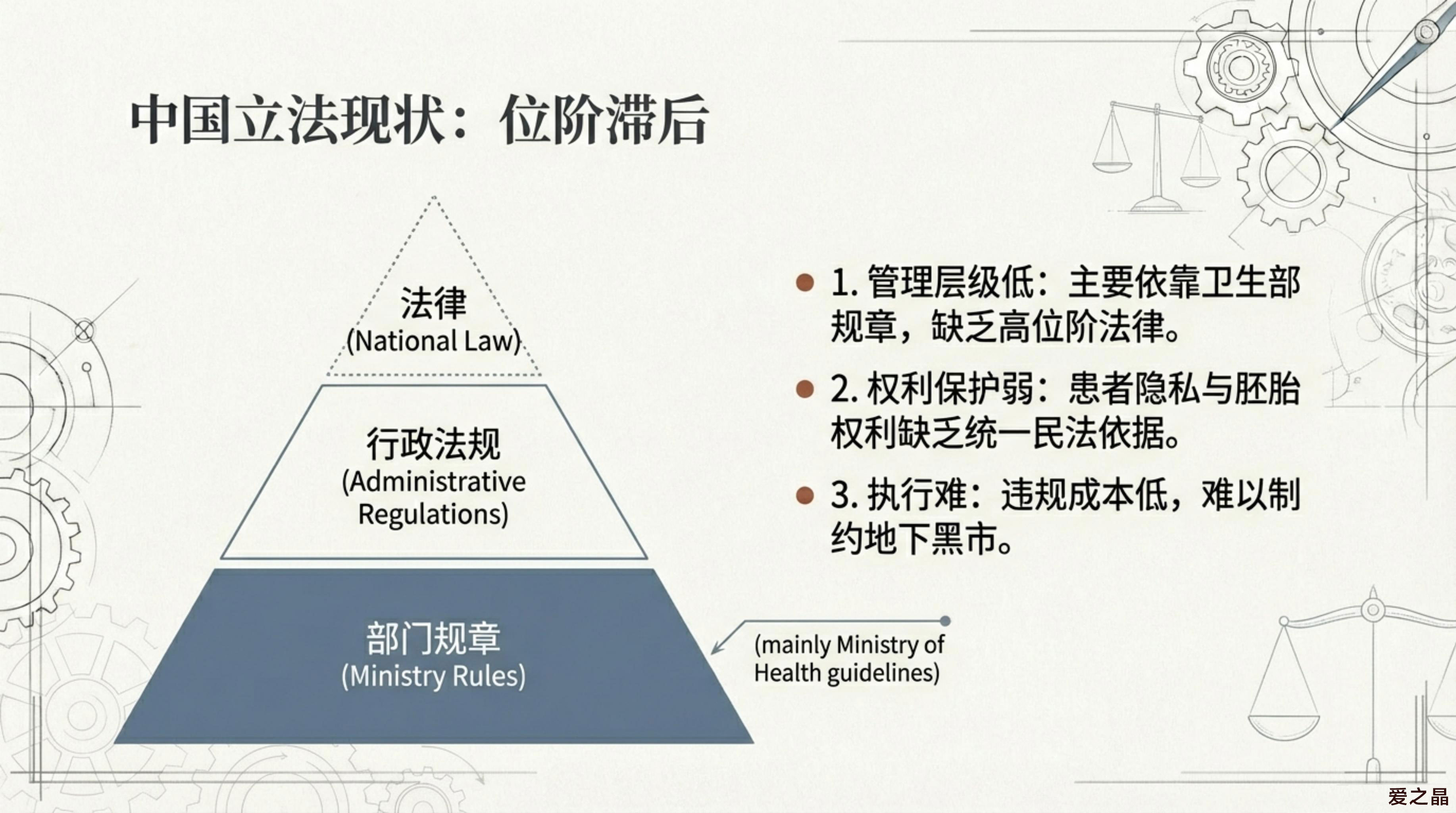 • 法律认定的困难: 这种复杂性使得血缘关系变得模糊,导致亲子关系在法律上难以认定。因此,各国都在尝试通过法律手段来调整由新技术产生的新的社会关系。